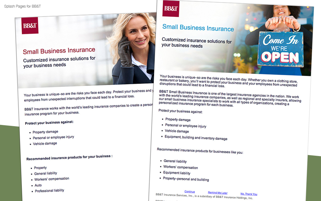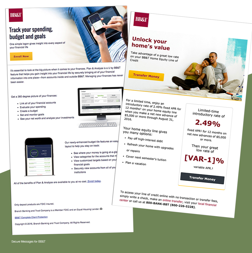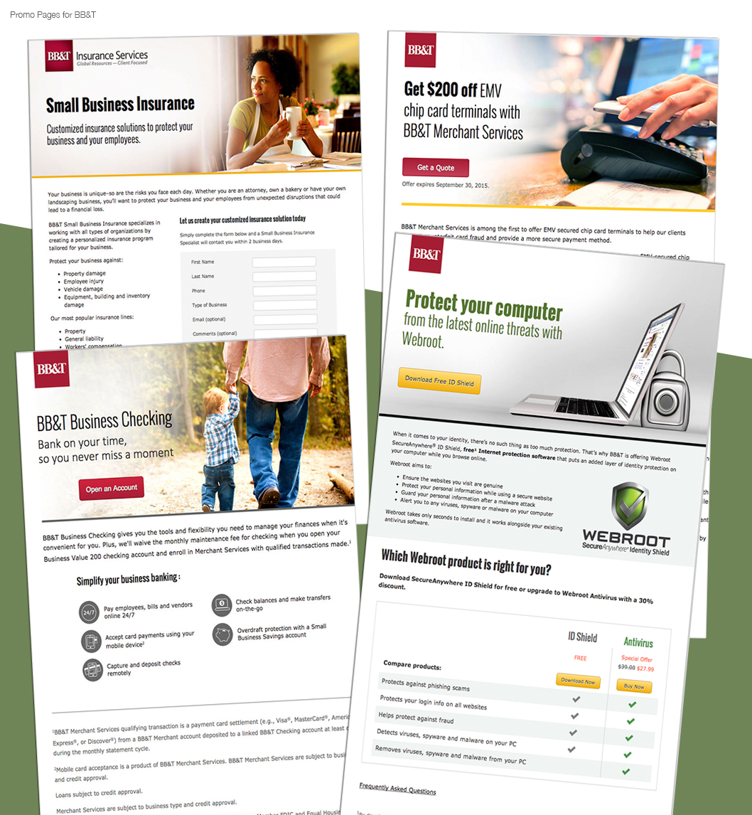 Designed, coded and updated Promo pages, secure messages, banners, emails, splash pages and landing pages for customers of BB&T's Personal and Small Business Online Banking platform, with a user base of over 2 million.