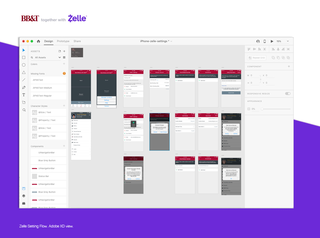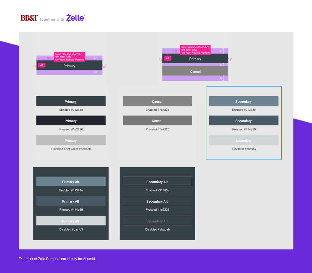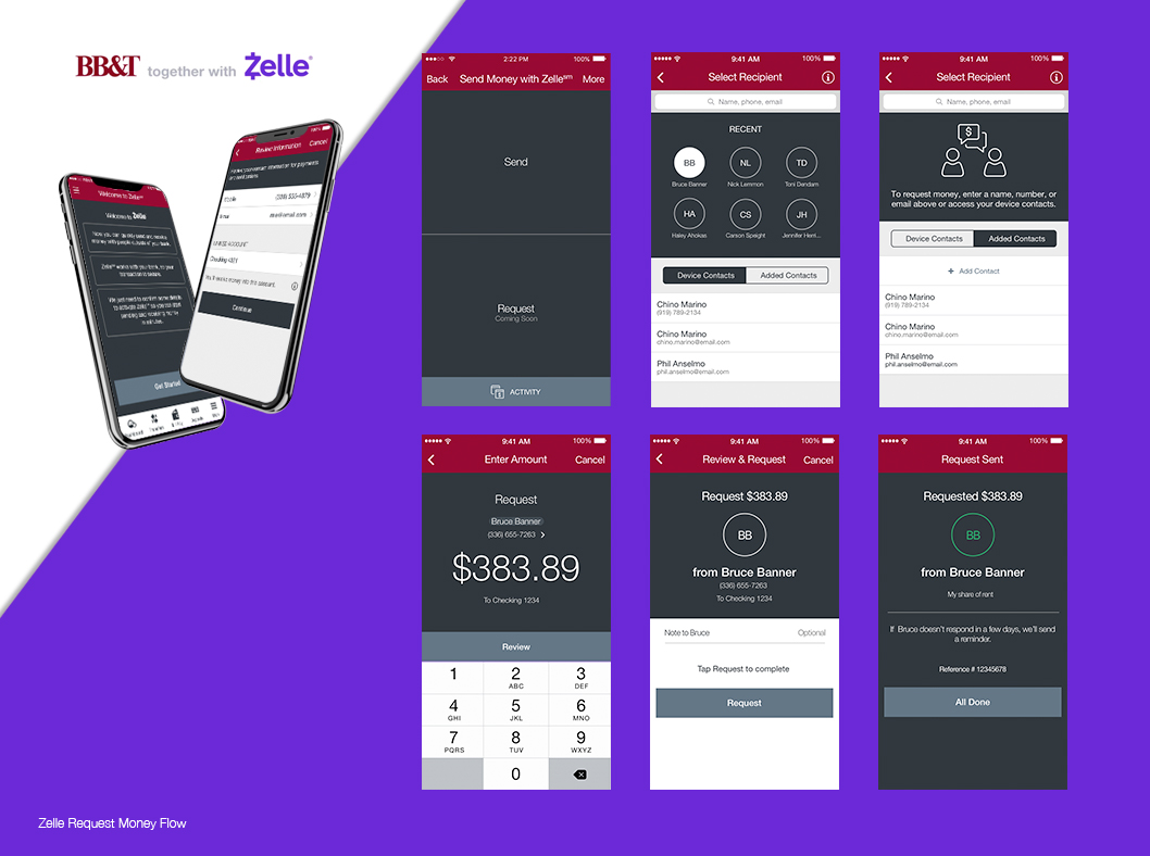 The original color for the Zelle logo is purple, so I used a black and/or white version of the logo and one with the BB&T colors to stay aligned with the rest of the U application. I cooperated with U application team almost on daily basis to make sure both applications had excellent synergy.
